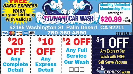 Get reviews hours directions coupons and more for Tsunami Car Wash at 42185 Washington St Palm Desert CA 92211. The basic wash. Thank you for allowing us to earn your business.